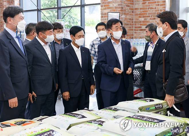 (철원=연합뉴스) 18일 강원 철원군을 초도 방문한 김진태 강원도지사가 김화농협 하나로마트에서 이현종 군수, 김용욱 강원농협 본부장 등과 함께 대화하고 있다.