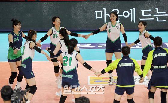 '2022 순천·도드람컵 프로배구대회' 페퍼저축은행과 현대건설의 경기가 18일 오후 전남 순천 팔마체육관에서 열렸다. 현대건설이 세트스코어 3-0(25-22, 25-14, 25-14) 으로 승리했다. 경기종료후 현대건설 선수들이 기뻐하고있다.