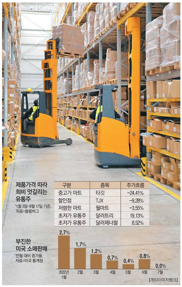 안석훈 키움증권 글로벌리서치팀장은 "저렴한 제품을 중심으로 판매하는 월마트·달러트리·달러제너럴 등 유통 기업이 중고가 제품을 취급하는 타깃 등보다 주가 흐름이 한동안 좋을 것"이라며 "다만 달러트리와 달러제너럴은 주가가 다소 오른 상태라 차익 실현이 있을 수 있다"고 말했다. 그는 "소비자들이 돈을 써야 유통 기업이 좋기 때문에 산업 전반에 걸쳐 부진했던 3분기 이후 4분기 연말 쇼핑시즌에 좋아질 가능성도 있다"며 "아직 미국은 팬데믹 때 저축한 정부지원금이 넉넉한 상황"이라고 덧붙였다.
