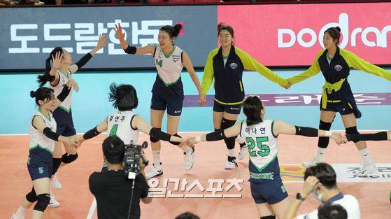 '2022 순천·도드람컵 프로배구대회' 페퍼저축은행과 현대건설의 경기가 18일 오후 전남 순천 팔마체육관에서 열렸다. 현대건설이 세트스코어 3-0(25-22, 25-14, 25-14) 으로 승리했다. 경기종료후 현대건설 선수들이 기뻐하고있다.