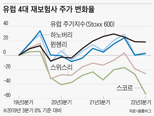 세계 1위 재보험사로 꼽히는 뮌헨리(Munich Re)는 2분기 순이익이 7억6800만유로(약 1조310억원)로 전년 동기 순이익(11억600만유로) 대비 30% 넘게 급감했다고 지난 9일(현지 시각) 발표했다. 증시 침체에 따른 투자 수익 감소, 러시아·우크라이나 전쟁으로 인한 보험 청구액 증가, 남미 지역 가뭄 등 자연 재해를 주요 원인으로 꼽았다. 세계 2위 재보험사 스위스리(Swiss Re)도 상반기 순이익이 1억5700만달러(약 2045억원)로 작년 동기(10억5000만달러) 대비 85% 급감했다.
