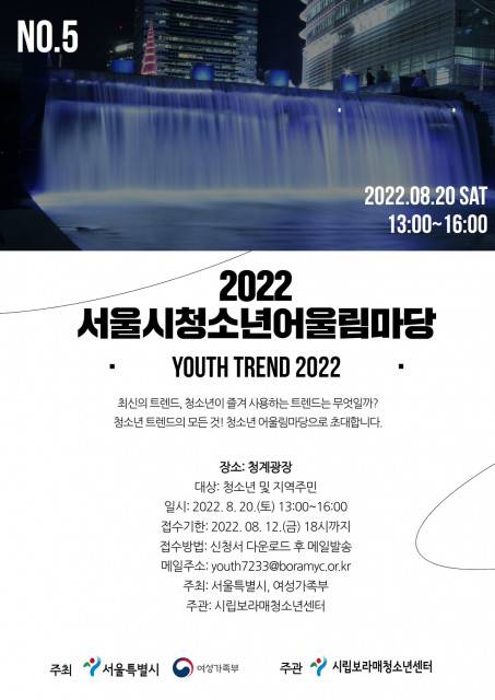 서울특별시와 여성가족부가 주최하고 시립보라매청소년센터가 주관하는 5회 서울시청소년어울림마당은 8월 20일에 청계광장에서 ‘청소년의 트렌드, YOUTH-TREND’라는 주제로 개최된다고 밝혔다.
