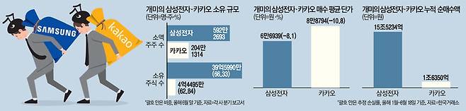 개미들의 국민주 사랑과는 반대로 방향성 매매에 중요한 외국인과 기관투자자들은 올해 삼성전자·카카오 주식에 대해 매도세를 유지하고 있다. 특히 외국인투자자들은 올해 삼성전자와 카카오 주식을 각각 8조3901억원, 1조1680억원 순매도했다. 삼성전자의 외국인 지분율도 50%대가 깨져 현재 49%대에 머물고 있다.