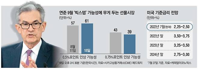 매파적 발언이 다소 누그러지자 시장에서는 9월 FOMC 정례회의에서 연준이 세 번 연속 자이언트스텝을 밟는 대신 기준금리 0.5%포인트 인상을 결정할 것이라는 관측이 우세해졌다. 시카고상품거래소(CME) 페드워치에 따르면 연방기금 금리선물 시장에서 9월에 기준금리가 0.5%포인트 인상될 것으로 전망하는 의견이 61%로, 0.75%포인트 인상 전망(39%)을 크게 앞섰다.