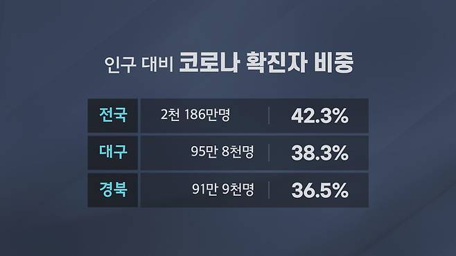 여기에 비해 대구는 누적 확진자 수가 91만 9천여 명으로 대구시 인구의 38.3%가 코로나에 걸렸고 경북의 누적 확진자 수는 95만 8천 명으로 경북 인구의 36.5%가 코로나에 걸렸습니다.