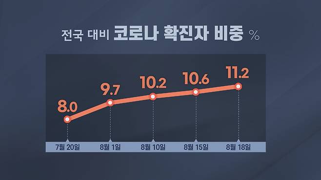 8월 1일 대구·경북 확진자 수는 4천 3백여 명으로 전국 확진자의 9.7%로 늘더니 8월 10일 10.2%, 8월 15일 10.6%, 오늘은 11.2%까지 올라갔습니다.