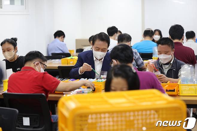 (서울=뉴스1) 오대일 기자 = 윤석열 대통령이 18일 오후 서울 강남구 충현복지관 보호작업장에서 발달장애인 훈련생 및 근로인들과 색연필 포장 작업을 체험하고 있다. (대통령실 제공) 2022.8.18/뉴스1