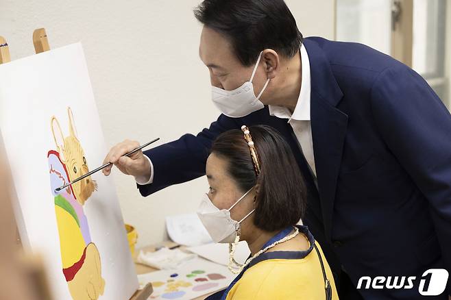 (서울=뉴스1) 오대일 기자 = 윤석열 대통령이 18일 오후 서울 강남구 충현복지관을 방문, 발달장애인 교육생들의 회화 수업을 참관하며 그림을 그려보고 있다. (대통령실 제공) 2022.8.18/뉴스1