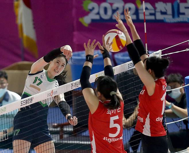 [서울=뉴시스] 조수정 기자 = 18일 순천팔마체육관에서 열린 2022순천도드람컵프로배구대회 현대건설과 페퍼저축은행 경기, 현대건설 고예림이 공격하고 있다. (사진=현대건설 배구단 제공) 2022.08.18. photo@newsis.com