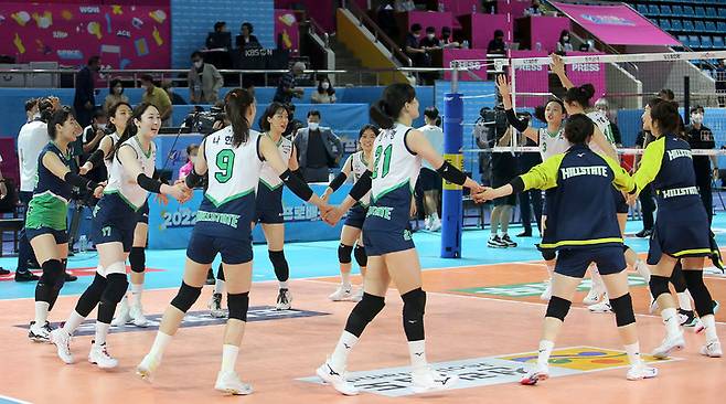 [서울=뉴시스] 조수정 기자 = 18일 순천팔마체육관에서 열린 2022순천도드람컵프로배구대회 현대건설과 페퍼저축은행 경기, 현대건설 선수들이 세트스코어 3-0으로 승리, 환호하고 있다. (사진=현대건설 배구단 제공) 2022.08.18. photo@newsis.com