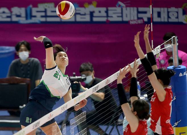 [서울=뉴시스] 조수정 기자 = 18일 순천팔마체육관에서 열린 2022순천도드람컵프로배구대회 현대건설과 페퍼저축은행 경기, 현대건설 정시영이 공격하고 있다. (사진=현대건설 배구단 제공) 2022.08.18. photo@newsis.com *재판매 및 DB 금지