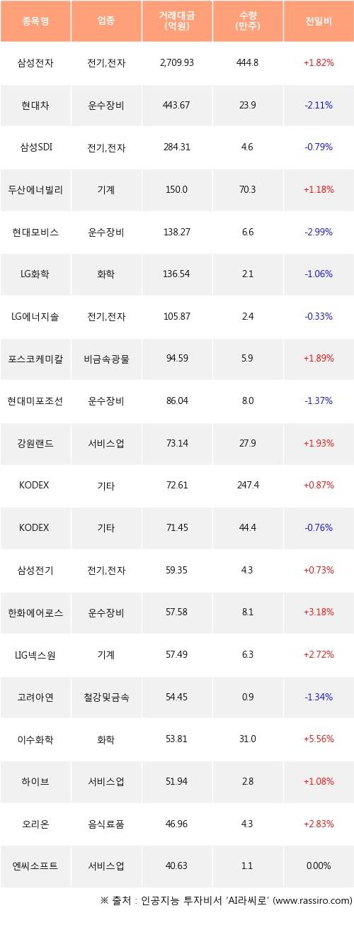 외국인 투자자의 순매수 상위 20개 종목은 삼성전자, 현대차, 삼성SDI, 두산에너빌리티, 현대모비스, LG화학, LG에너지솔루션, 포스코케미칼, 현대미포조선, 강원랜드등이다.