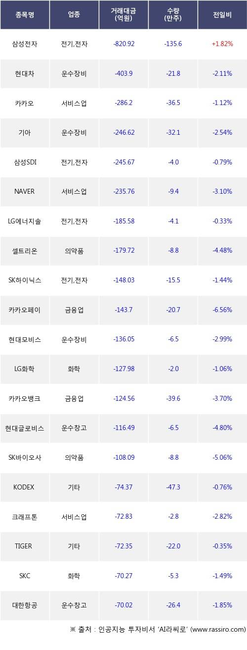 기관 투자자의 순매도 상위 20개 종목은 삼성전자, 현대차, 카카오, 기아, 삼성SDI, NAVER, LG에너지솔루션, 셀트리온, SK하이닉스, 카카오페이등이다.