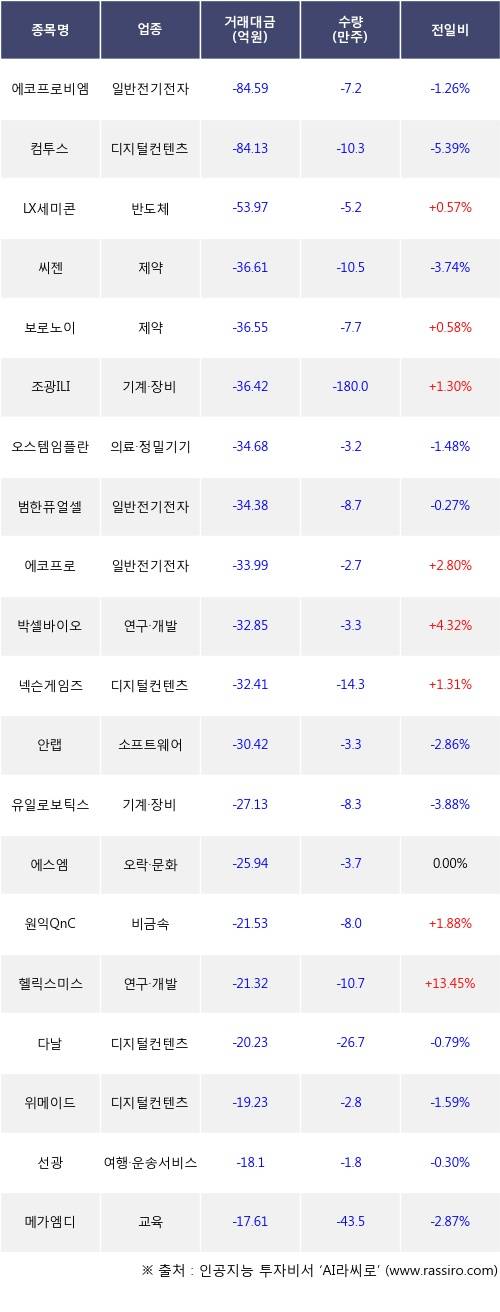외국인 투자자의 순매도 상위 20개 종목은 에코프로비엠, 컴투스, LX세미콘, 씨젠, 보로노이, 조광ILI, 오스템임플란트, 범한퓨얼셀, 에코프로, 박셀바이오등이다.