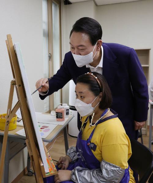 윤석열 대통령이 18일 서울 강남구 충현복지관에서 열린 발달장애인 회화수업에 참여해 함께 그림을 그리고 있다. 윤 대통령은 “어려운 경제 상황일수록 공공 부문의 허리띠를 졸라매서 사회적 약자를 더욱 두텁게 지원하는 데 쓸 것”이라고 말했다.