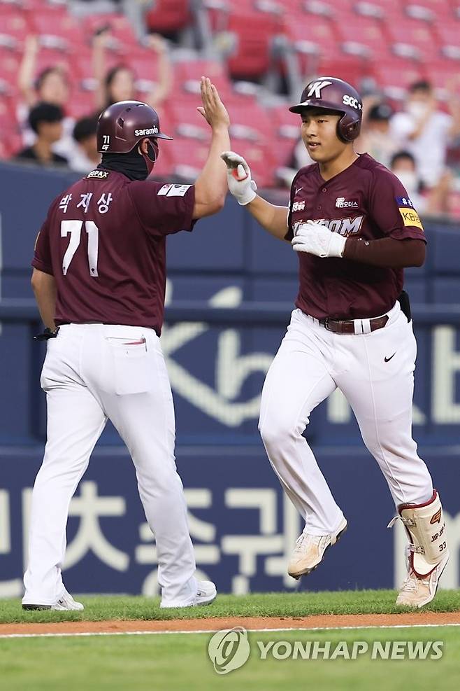 (서울=연합뉴스) 서대연 기자 = 18일 서울 송파구 잠실야구장에서 열린 2022 프로야구 KBO리그 키움 히어로즈와 두산 베어스의 경기. 2회초 1사 주자 없는 상황 키움 김휘집이 1점 홈런을 치고 세리머니를 하고 있다. 2022.8.18