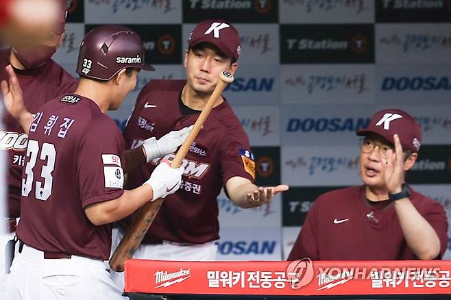 (서울=연합뉴스) 서대연 기자 = 18일 서울 송파구 잠실야구장에서 열린 2022 프로야구 KBO리그 키움 히어로즈와 두산 베어스의 경기. 2회초 1사 주자 없는 상황 키움 김휘집이 솔로홈런을 치고 더그아웃에서 동료들의 환영을 받고 있다. 2022.8.18
