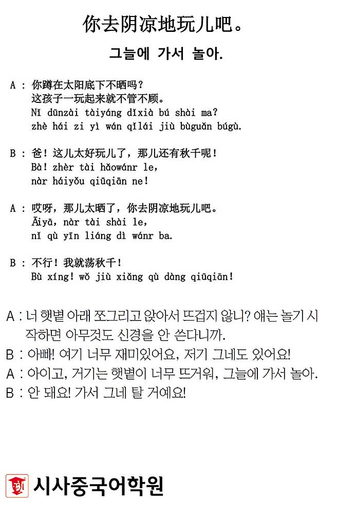 [시사중국어학원의 리얼 중국어 회화] 그늘에 가서 놀아.