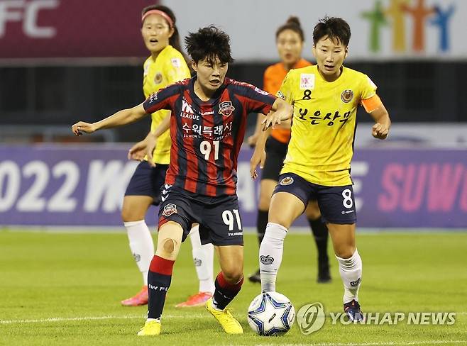 (수원=연합뉴스) 홍기원 기자 = 18일 경기도 수원종합운동장에서 열린 WK리그 수원FC 위민과 보은 상무의 경기. 수원FC 위민 지소연이 드리블하고 있다. 2022.8.18