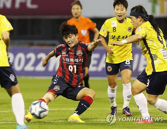 (수원=연합뉴스) 홍기원 기자 = 18일 경기도 수원종합운동장에서 열린 WK리그 수원FC 위민과 보은 상무의 경기. 수원FC 위민 지소연이 슛하고 있다. 2022.8.18