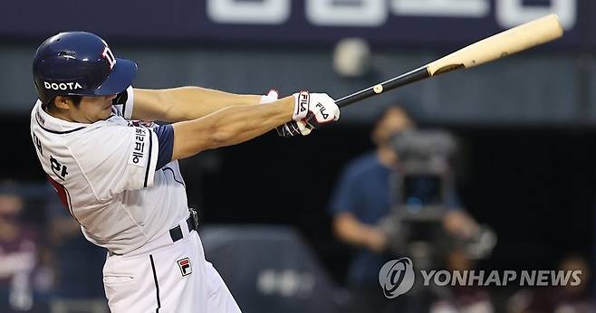 (서울=연합뉴스) 서대연 기자 = 18일 서울 송파구 잠실야구장에서 열린 2022 프로야구 KBO리그 키움 히어로즈와 두산 베어스의 경기. 3회말 무사 2루 두산 강대한이 희생플라이로 2루 주자 정수빈을 3루까지 진루시키고 있다. 2022.8.18