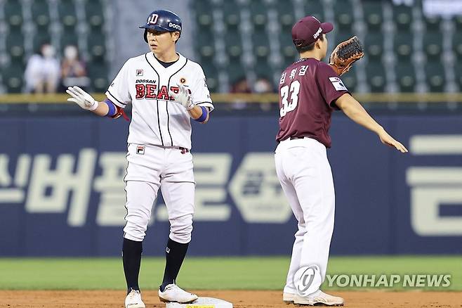 (서울=연합뉴스) 서대연 기자 = 18일 서울 송파구 잠실야구장에서 열린 2022 프로야구 KBO리그 키움 히어로즈와 두산 베어스의 경기. 3회말 두산 선두타자 정수빈이 2루타를 치고 세리머니를 하고 있다. 2022.8.18