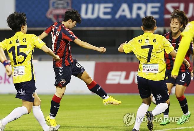 (수원=연합뉴스) 홍기원 기자 = 18일 경기도 수원종합운동장에서 열린 WK리그 수원FC 위민과 보은 상무의 경기. 수원FC 위민 지소연이 WK리그 데뷔골을 넣고 있다. 2022.8.18