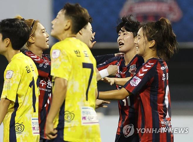 (수원=연합뉴스) 홍기원 기자 = 18일 경기도 수원종합운동장에서 열린 WK리그 수원FC 위민과 보은 상무의 경기. 골을 넣은 수원FC 위민 지소연이 기뻐하고 있다. 2022.8.18