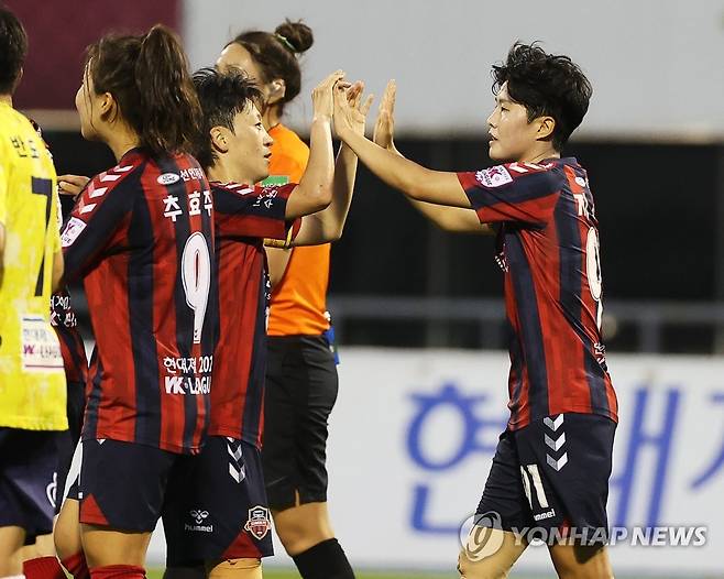 (수원=연합뉴스) 홍기원 기자 = 18일 경기도 수원종합운동장에서 열린 WK리그 수원FC 위민과 보은 상무의 경기. 골을 넣은 수원FC 위민 지소연이 기뻐하고 있다. 2022.8.18