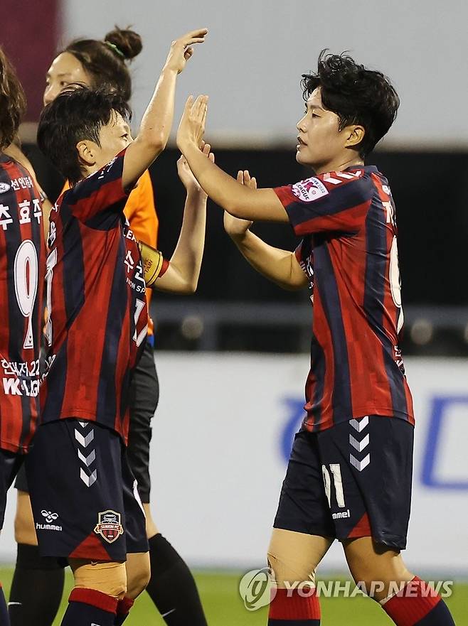 (수원=연합뉴스) 홍기원 기자 = 18일 경기도 수원종합운동장에서 열린 WK리그 수원FC 위민과 보은 상무의 경기. 골을 넣은 수원FC 위민 지소연이 기뻐하고 있다. 2022.8.18