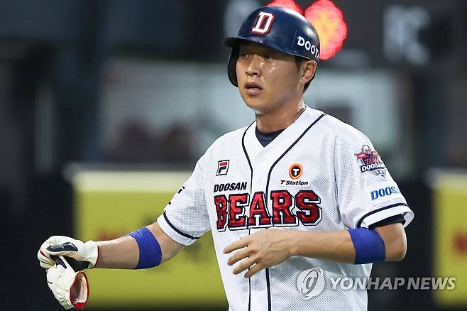 (서울=연합뉴스) 서대연 기자 = 18일 서울 송파구 잠실야구장에서 열린 2022 프로야구 KBO리그 키움 히어로즈와 두산 베어스의 경기. 3회말 2루타로 동점의 기점을 만든 정수빈이 김인태의 희생타로 홈인하고 있다. 2022.8.18