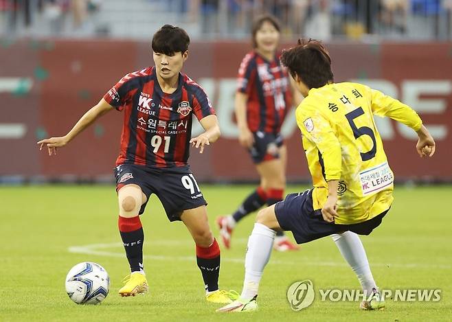 (수원=연합뉴스) 홍기원 기자 = 18일 경기도 수원종합운동장에서 열린 WK리그 수원FC 위민과 보은 상무의 경기. 수원FC 위민 지소연이 드리블하고 있다. 2022.8.18