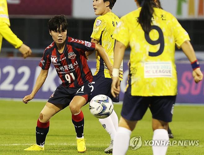 (수원=연합뉴스) 홍기원 기자 = 18일 경기도 수원종합운동장에서 열린 WK리그 수원FC 위민과 보은 상무의 경기. 수원FC 위민 지소연이 드리블하고 있다. 2022.8.18
