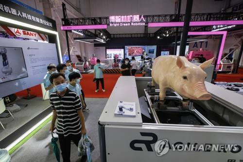 epa10127112 A visitor looks at an agriculture robot during the 2022 World Robot Conference (WRC) at Yichuang International Convention and Exhibition Center in Beijing, China, 18 August 2022. The 2022 WRC is held from 18 to 21 August and includes a conference on robotics, an exhibition and a robot competition with the participation of more than 130 robotics enterprises from 15 countries and regions that showcase more than 500 robot products. EPA/WU HAO