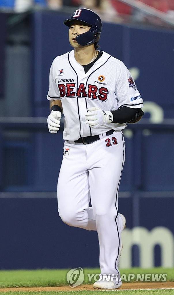 (서울=연합뉴스) 서대연 기자 = 18일 서울 송파구 잠실야구장에서 열린 2022 프로야구 KBO리그 키움 히어로즈와 두산 베어스의 경기. 5회말 1사 두산 강승호가 1점 홈런을 치고 달리고 있다. 2022.8.18