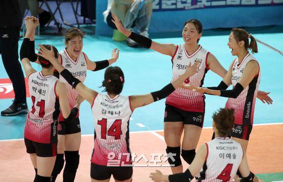 '2022 순천·도드람컵 프로배구대회' 한국도로공사와 KGC인삼공사의 경기가 18일 오후 전남 순천 팔마체육관에서 열렸다. 인삼공사가 득점을 한뒤 선수들이 기뻐하고있다.