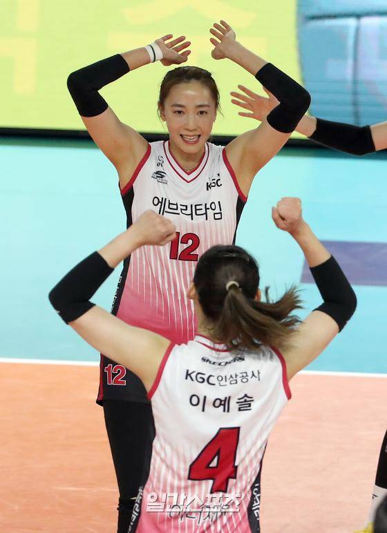 '2022 순천·도드람컵 프로배구대회' 한국도로공사와 KGC인삼공사의 경기가 18일 오후 전남 순천 팔마체육관에서 열렸다. 인삼공사 한송이가 득점 한뒤 이예솔과 기뻐하고있다.