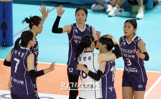 '2022 순천·도드람컵 프로배구대회' 한국도로공사와 KGC인삼공사의 경기가 18일 오후 전남 순천 팔마체육관에서 열렸다. 도로공사가 득점 하자 선수들이 기뻐하고있다.