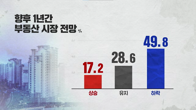 앞으로 1년간 집값 전망으로는 '지금보다 내릴 것'이라는 답변이 49.8%로 가장 많았고 오를 것이라는 답은 17.2%에 그쳤습니다.