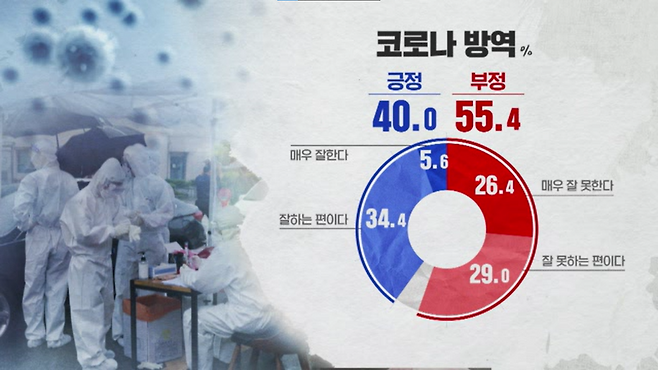 현 정부의 코로나 방역에 대해서는 부정 평가(55.4%)가 과반이었습니다.
