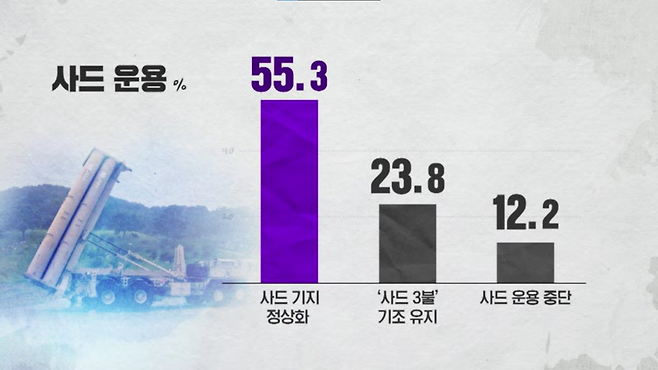 '중국과 관계 유지를 위해 '사드 3불' 기조를 유지해야 한다'가 23.8%, '중국의 추가 제재가 우려되므로 사드 운용을 중단해야 한다'는 12.2%였습니다.