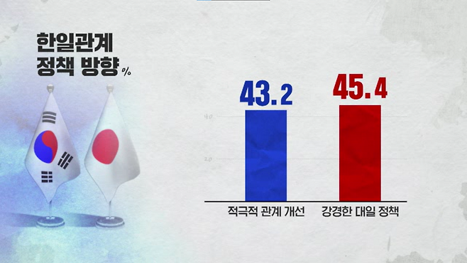 '적극적으로 관계 개선에 나서야 한다'가 43.2, '강경한 대일 정책을 펴야 한다'가 45.4%로 팽팽하게 맞섰습니다.