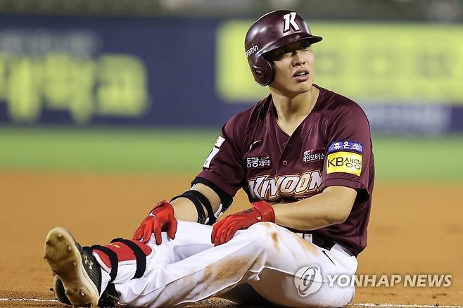 (서울=연합뉴스) 서대연 기자 = 18일 서울 송파구 잠실야구장에서 열린 2022 프로야구 KBO리그 키움 히어로즈와 두산 베어스의 경기. 6회초 2사 1, 2루 키움 송성문이 1루에서 아웃되자 억울해 하고 있다. 2022.8.18