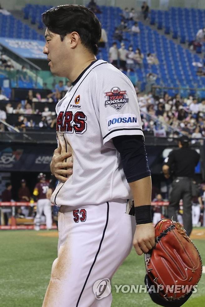 (서울=연합뉴스) 서대연 기자 = 18일 서울 송파구 잠실야구장에서 열린 2022 프로야구 KBO리그 키움 히어로즈와 두산 베어스의 경기. 6회초 2사 1, 2루 키움 송성문을 좋은 수비로 아웃시킨 양석환이 배를 만지며 고통스러워하고 있다. 2022.8.18