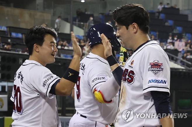 (서울=연합뉴스) 서대연 기자 = 18일 서울 송파구 잠실야구장에서 열린 2022 프로야구 KBO리그 키움 히어로즈와 두산 베어스의 경기. 6회초 2사 1, 2루 키움 송성문을 좋은 수비로 아웃시킨 두산 양석환이 웃으며 동료들과 기뻐하고 있다. 2022.8.18
