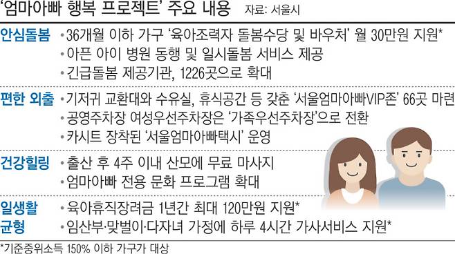 서울에서 36개월 이하 영아를 조부모 등 4촌 이내 친·인척에게 맡기는 경우 아이 1명당 월 30만원 돌봄수당이 지원된다. 기존 여성우선주차장은 임산부와 영·유아 동반 차량 등을 위한 ‘가족우선주차장’으로 바뀌며, 카시트가 장착된 ‘서울엄마아빠택시’도 운영된다. 육아휴직 급여와는 별도의 ‘엄마아빠 육아휴직 장려금’도 내년부터 연간 최대 120만원 지원된다.