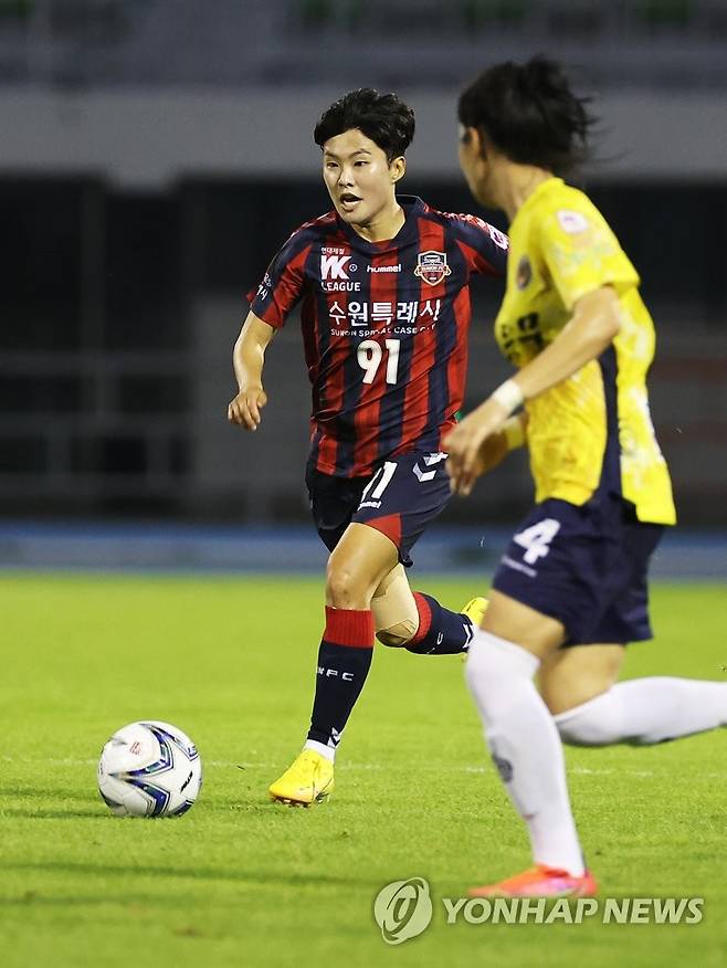 (수원=연합뉴스) 홍기원 기자 = 18일 경기도 수원종합운동장에서 열린 WK리그 수원FC 위민과 보은 상무의 경기. 수원FC 위민 지소연이 드리블하고 있다. 2022.8.18