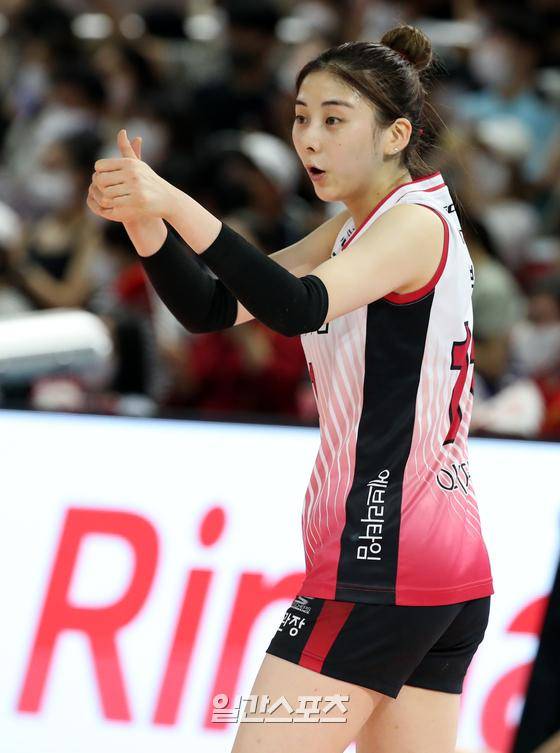 '2022 순천·도드람컵 프로배구대회' 한국도로공사와 KGC인삼공사의 경기가 18일 오후 전남 순천 팔마체육관에서 열렸다. 인삼공사 박혜민이 경기중 엄지척하고있다.