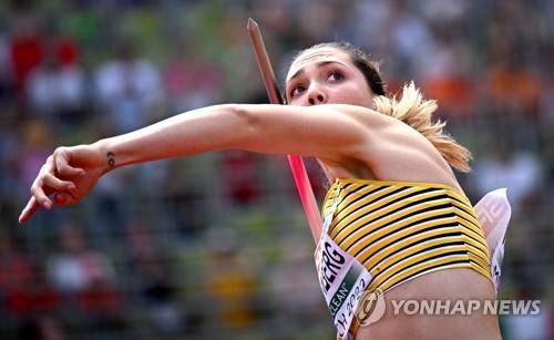 epa10127204 Sophie Weissenberg of Germany competes in the Javelin Throw of the Heptathlon during the Athletics events at the European Championships Munich 2022, Munich, Germany, 18 August 2022. The championships will feature nine Olympic sports, Athletics, Beach Volleyball, Canoe Sprint, Cycling, Artistic Gymnastics, Rowing, Sport Climbing, Table Tennis and Triathlon. EPA/CHRISTIAN BRUNA
