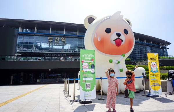 ‘열받곰’ 풍선인형이 18일 부산 동구 부산역 광장에 전시돼 있다. 국제환경단체 그린피스가 높이 6m 규모로 제작한 열받곰은 기후변화로 녹아내린 빙하에 열받은 북극곰 스토리를 담아낸 캐릭터다. 부산시설공단 제공